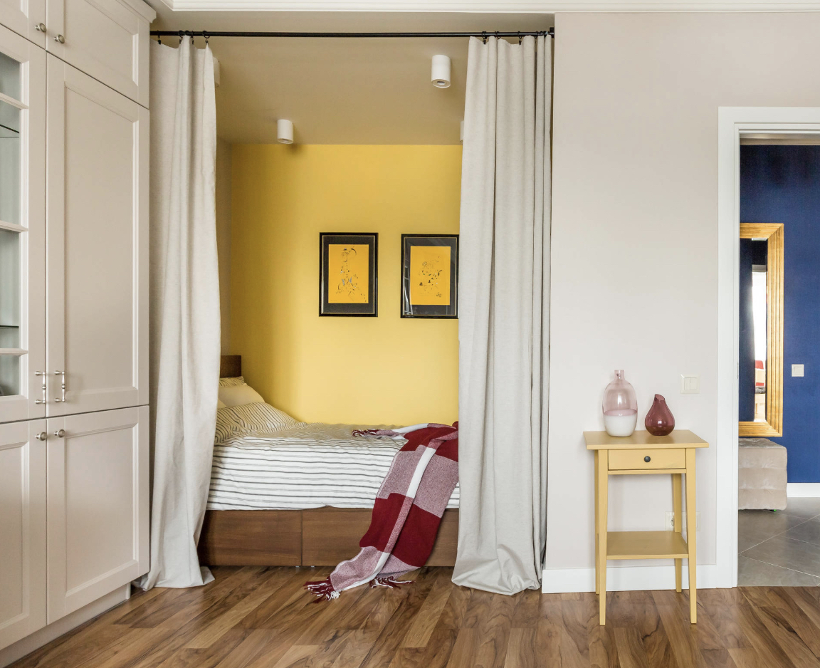 Проще всего отделить спальное место с помощью занавеса. Это не идеальный вариант - ведь площадь комнаты значительно уменьшается, но зато постель точно скрыта от посторонних глаз.
