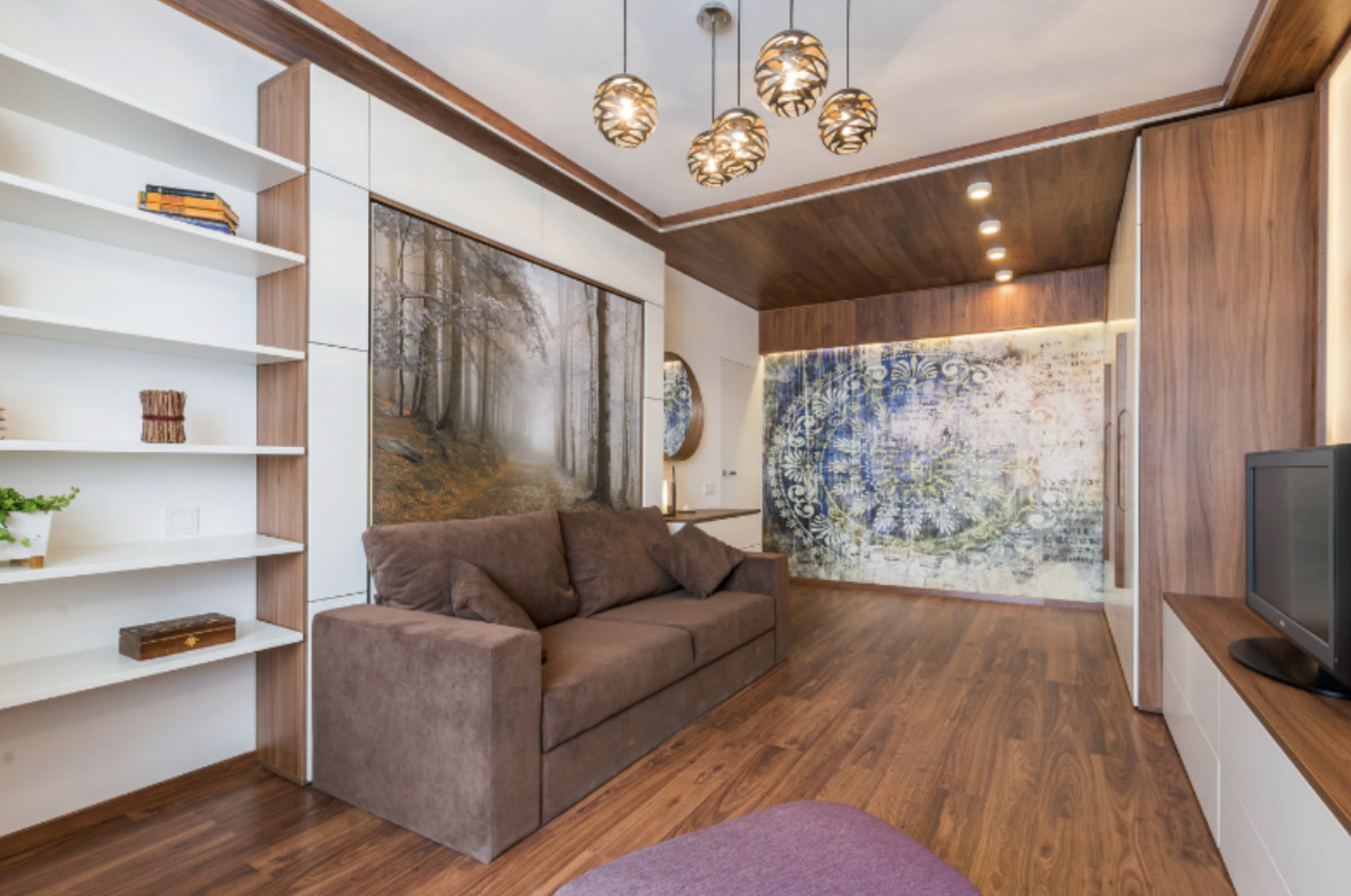 Ещё один “потолочный” вариант - кровать-подвес. Чтобы опустить такую потайную кровать, достаточно нажать кнопку специального механизма. Очевидный минус потолочных конструкций - невозможность прилечь и отдохнуть среди дня, каждый раз сначала придется приводить кровать в рабочее положение.