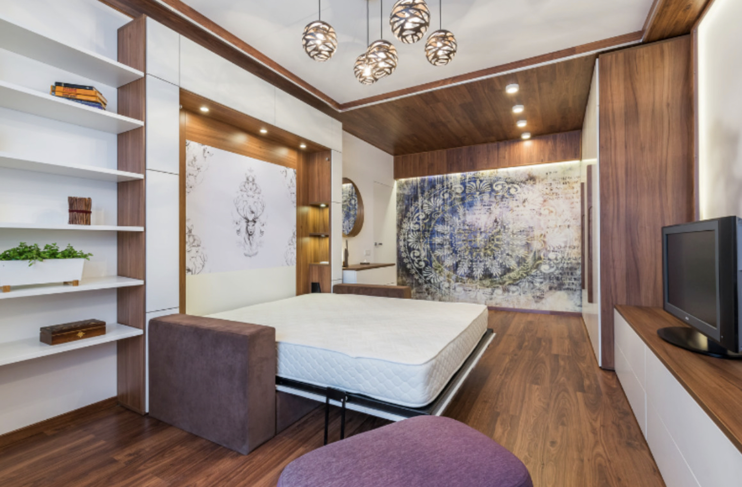 Более сложный вариант - трансформирующаяся кровать, которая в вертикальном положении образует стенку шкафа. Поднимать и опускать такую кровать легко с помощью специального механизма.