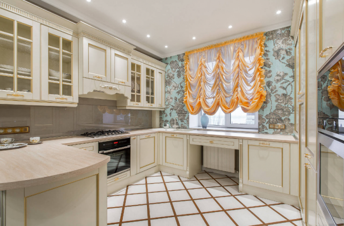На фото австрийские плотные занавеси на окнах в кухне в классическом стиле.