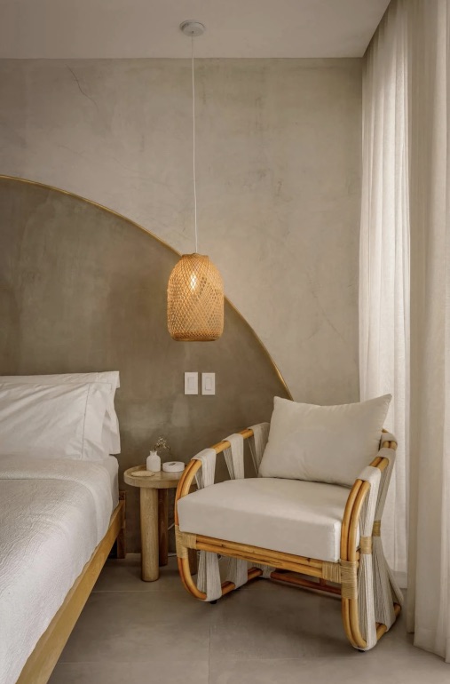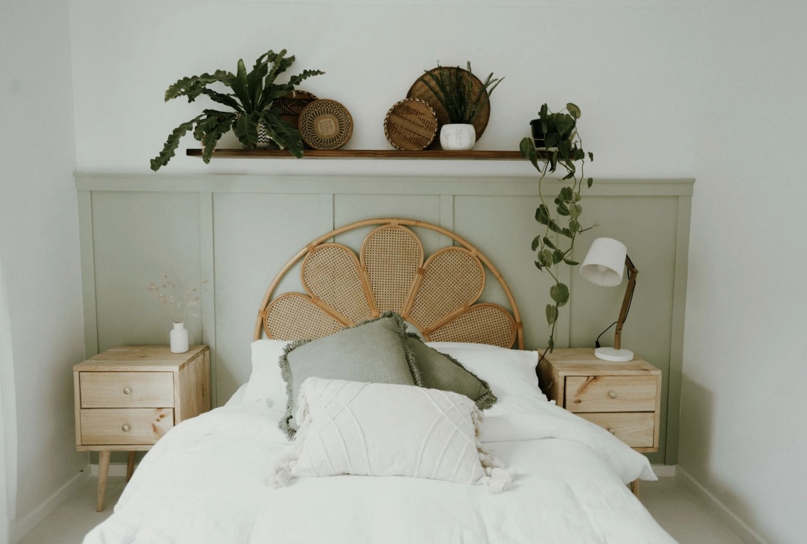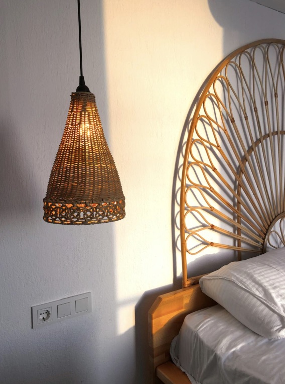 - Спальня. Популярный вариант — изголовье кровати. Также можно постелить коврики-циновки, поставить на тумбы бамбуковые светильники.