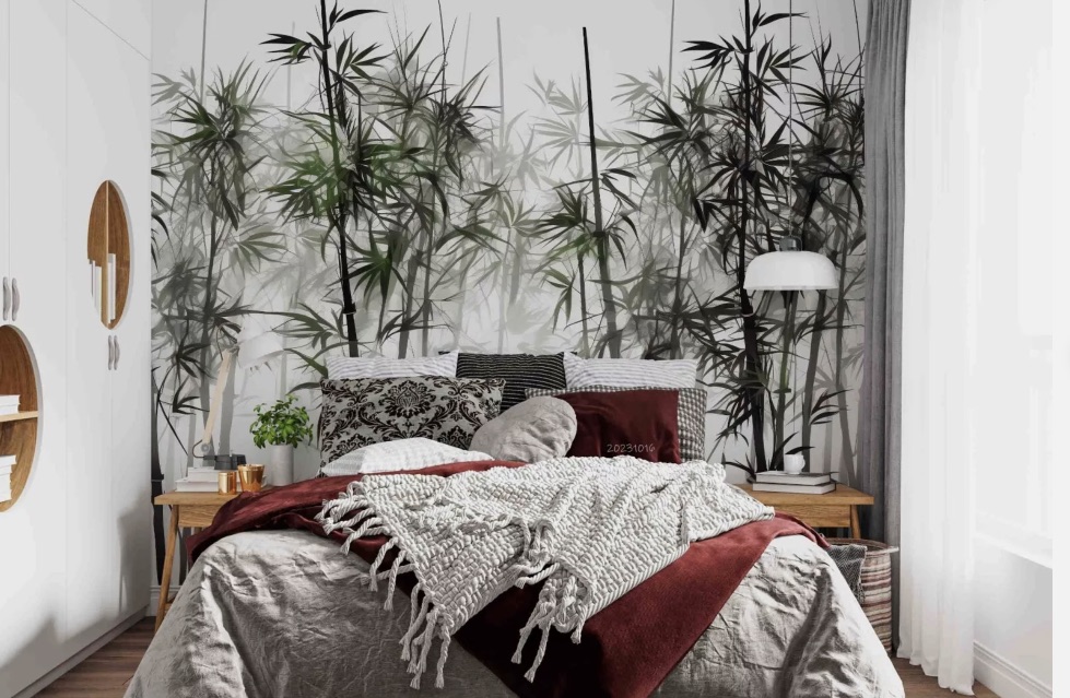 В интерьере не всегда используют стебли бамбука: в некоторых случаях достаточно имитации фактуры или внешнего вида. Простой способ — рисунок или наклейка. Украшают стены, мебель, текстиль. Эффектно смотрятся фотообои с изображением бамбуковой рощи.