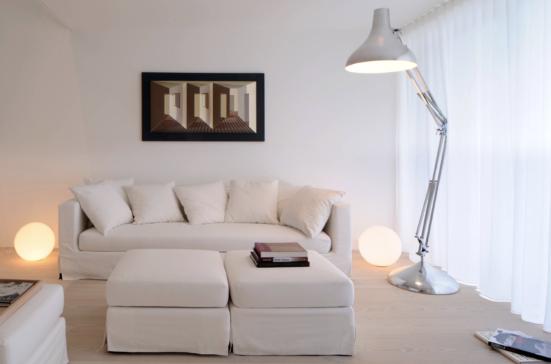 Современные направления, такие как хай-тек или минимализм отличаются своей практичностью, строгостью и отсутствием лишних деталей. Белый диван имеет простую форму и прямые линии, может быть дополнен металлическими деталями, пледом или парой декоративных подушек.
