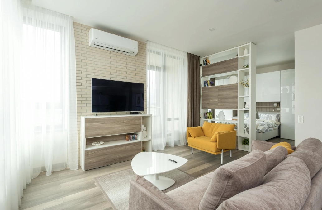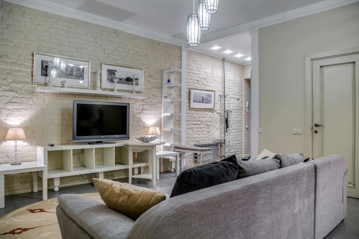 Если гостиная совмещена с кухней или столовой, с помощью белой кирпичной стены в интерьере можно выделить зону отдыха, либо зону приготовления пищи, создав таким образом их визуальное разделение. Если в комнате есть камин, эффектно будет смотреться облицовка не только стены, но и самого камина белым кирпичом.