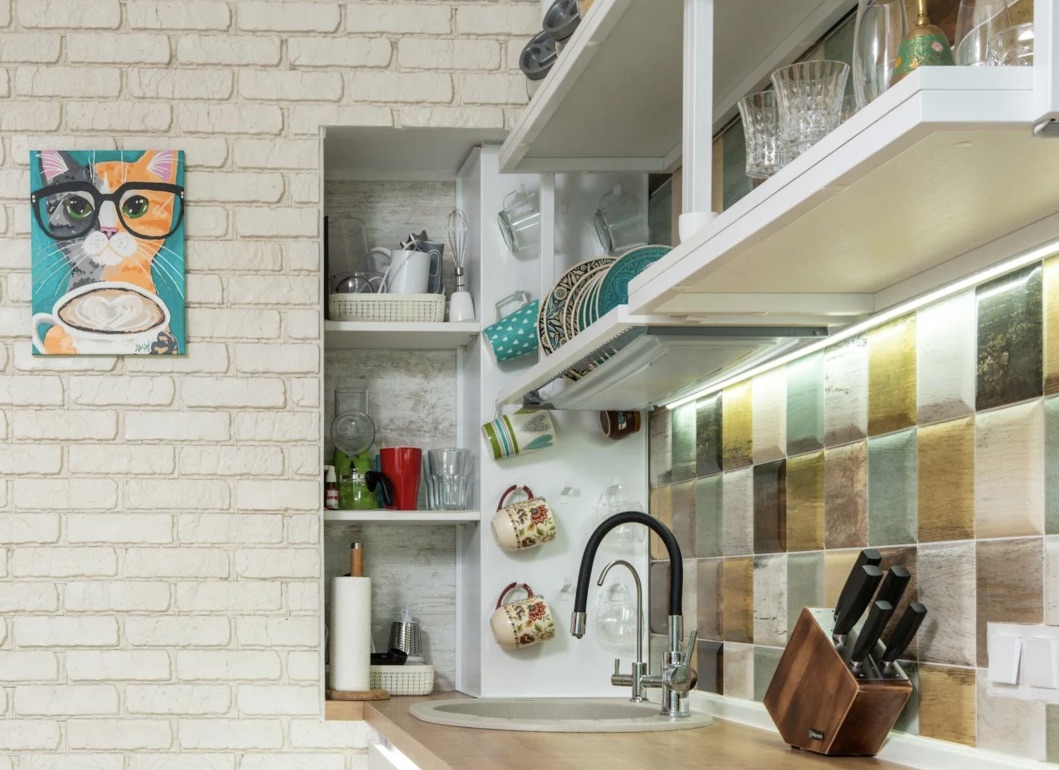 Самый часто встречающийся вариант - отделка белым кирпичом кухонного фартука. В том случае, если кухня небольшая, и присутствуют навесные шкафы, это будет наиболее удачным решением, причем декоративный кирпич лучше заменить на его имитацию из плитки - это более практично.