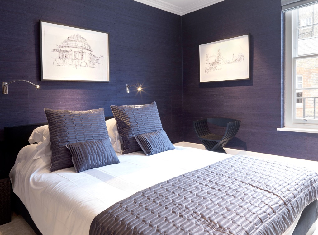 - Интерьер спальни в пурпурных оттенках и цвете индиго создаст атмосферу загадочности, а шелковые аметистовые шторы с такой же обивкой изголовья кровати создают ощущение роскоши.