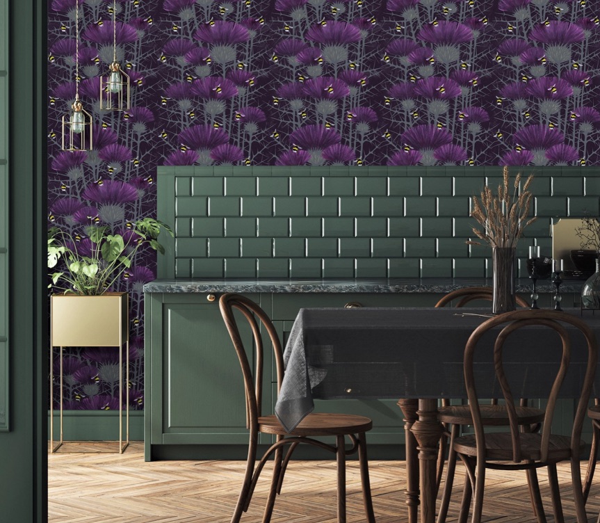 - Просторную кухню украсит яркая лиловая плитка над рабочей поверхностью, фиолетовые часы и нижний фасад мебели.
