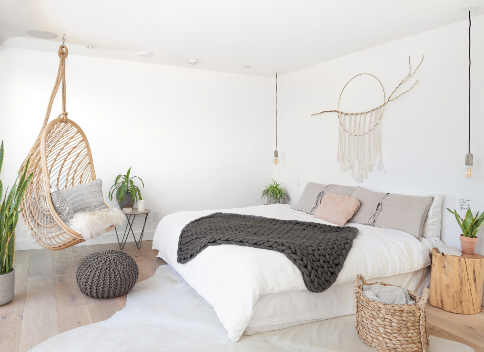 Если в вашей спальне есть уголок отдыха, его можно оборудовать подвесными качелями.