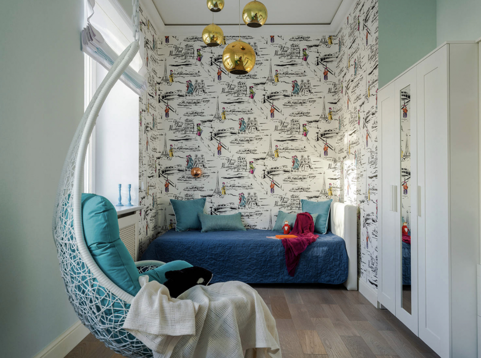 На фото подвесное кресло в интерьере небольшой детской комнаты.