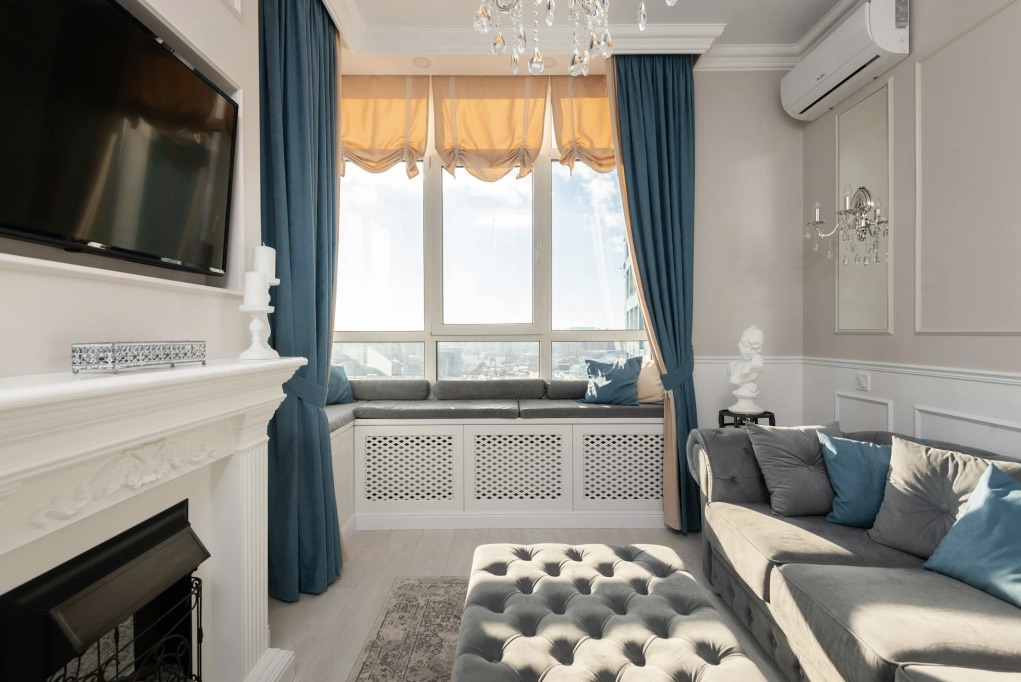 Для защиты от солнца повесьте лаконичные рулонные шторы, и, при необходимости, закройте батарею специальной решеткой.