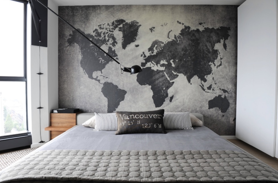 При оформлении спальни карту обычно размещают на стене, примыкающей к изголовью.