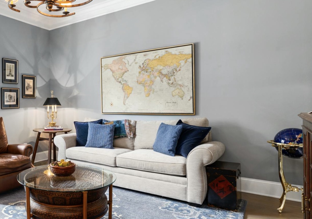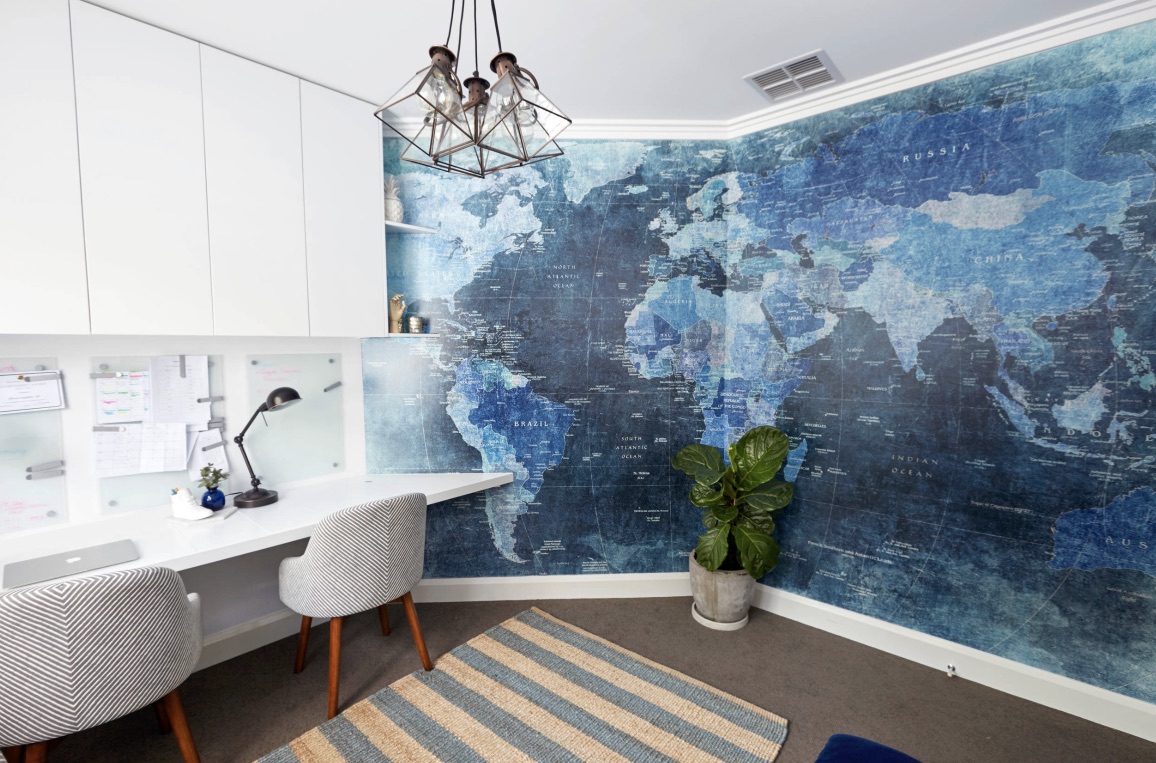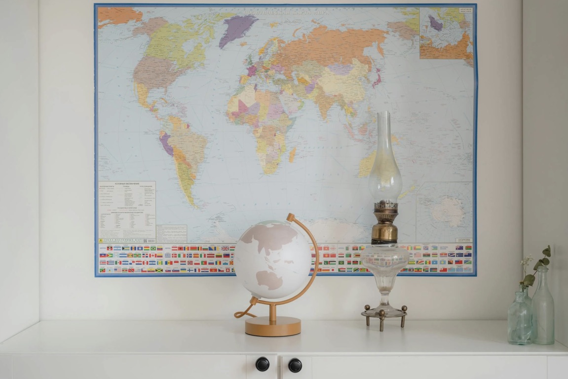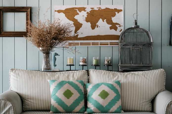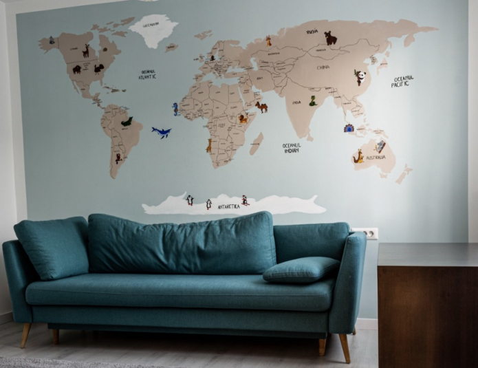 Основное правило: других декоративных элементов не должно быть много, и они не должны отвлекать внимание на себя. Пусть карта мира в интерьере станет главной составляющей, а окружение станет спокойным фоном для нее.