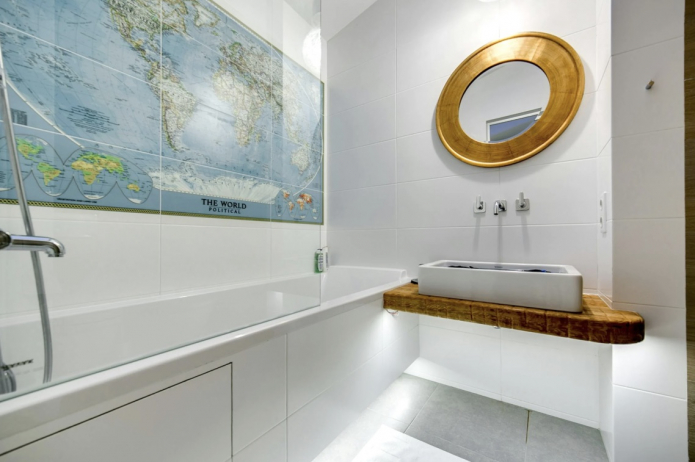 Помещение ванной комнаты, оформленное в морском стиле, удачно дополнят карты великих географических открытий. Карты можно использовать как в отделке (обои или плитка), так и в качестве декоративных элементов (шторки для ванны или постеры).