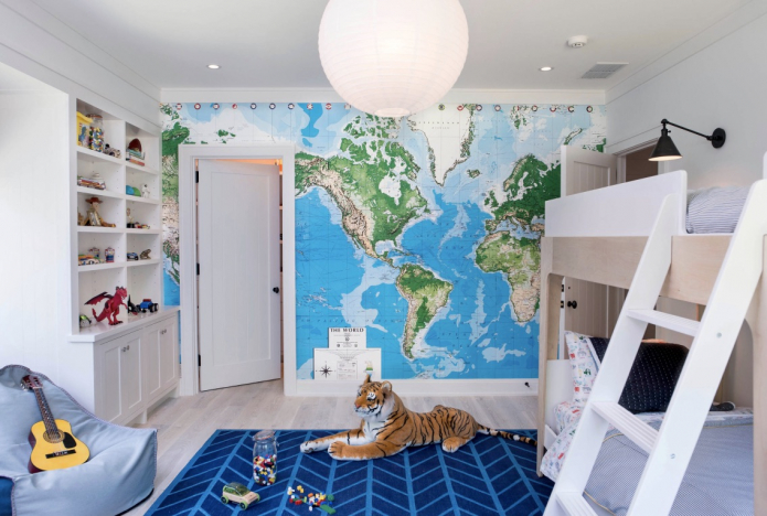 Как правило, собственно карту, то есть рисунок земной поверхности, располагают на одной из стен, покрывая остальные стены нейтральными светлыми оттенками, например, бежевым, оливковым, белым.