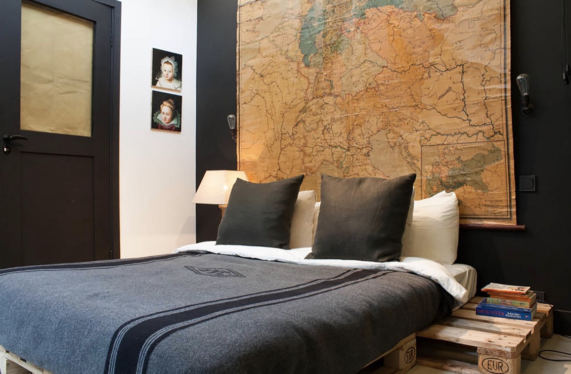 Интересная идея - визуальное разделение пространства с помощью карт. Например, в рабочей зоне - обои с изображением карты или схемы, а в спальной - любой другой вид отделки.