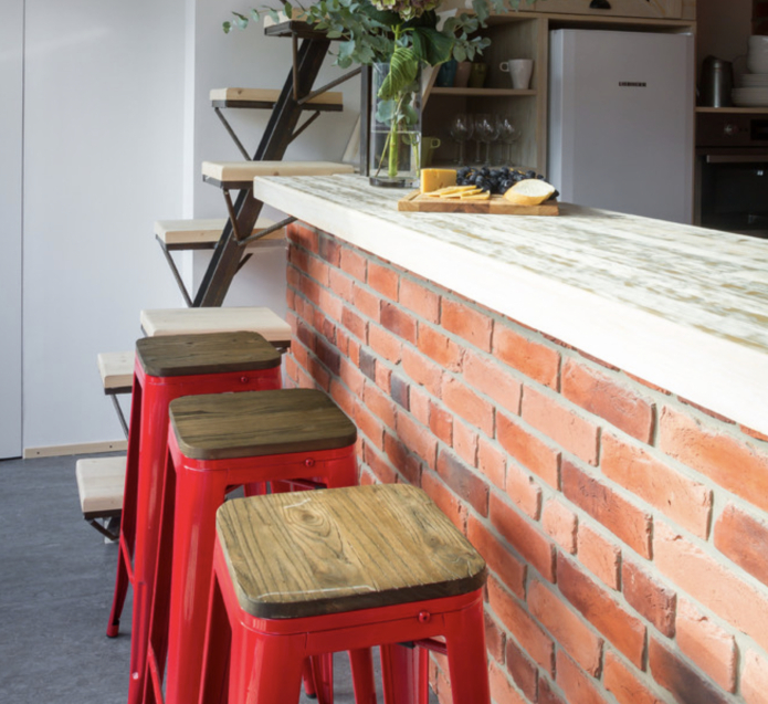 В дизайне стена в гостиной, кухне, спальне, а также барная стойка отделяющая гостиную зону от кухонной выполнены из декоративного «состаренного» кирпича.