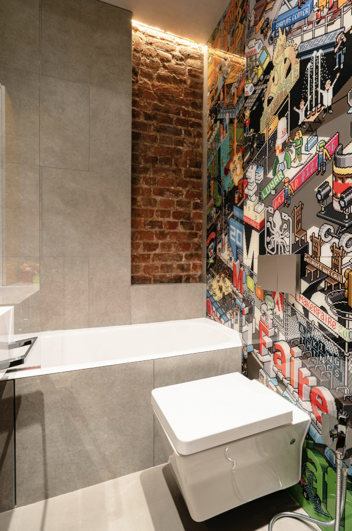 На фото плитка под белый кирпич в интерьере ванной комнаты. Проект: «Стиль лофт в интерьере квартиры 85 кв. м.»