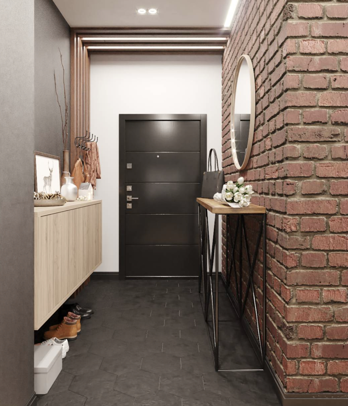 Здесь кирпичная кладка поможет отделить входную зону от остальных, либо богатой кирпичной фактурой на стенах, либо отдельно стоящей перегородкой из кирпичей, если позволяет площадь. Можно оформить кладкой участок стены в прихожей, отведенный под вешалку для одежды, тем самым выделив ее в отдельную зону. Эффектно смотрятся возле кирпичной стены столики-консоли для перчаток и прочих мелочей, над которыми вешают большое зеркало.