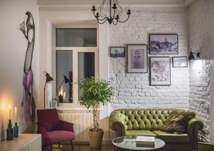 Оригинальный дизайн квартиры выполнен в ярких тонах. В отделке стен применяется кирпичная кладка, покраска, обои, мозаика, и даже зелень живых растений. Комбинация расцветок и фактур выбрана так, что все это многообразие отлично сочетается и формирует гармоничный и уютный интерьер.