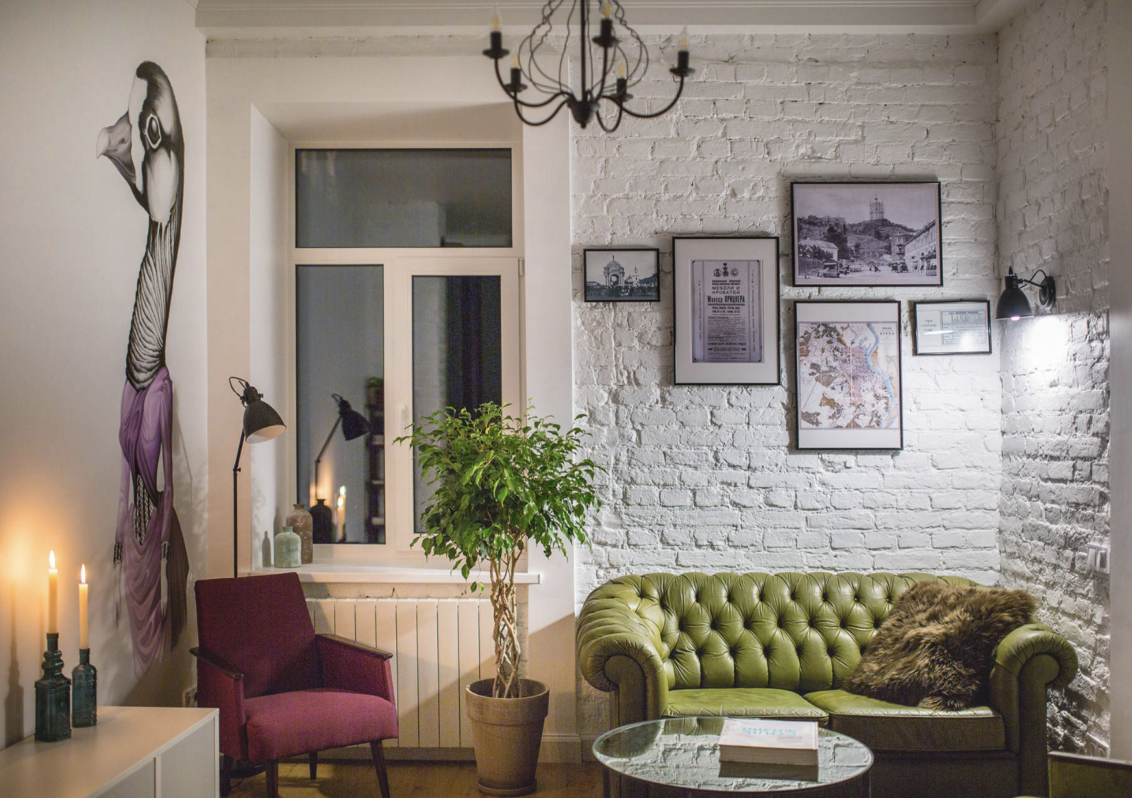 После выполнения реставрационных работ на виду оказались стены из старого кирпича. Это и стало основной интерьера в стиле лофт.