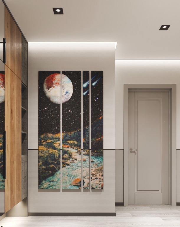 Здесь лучше повесить четкие, геометрические изображения, простые и понятные с первого взгляда – ведь во входной зоне не задерживаются надолго, и рассматривать картину будет некогда. Графика – отличный выбор для помещения в стиле минимализма, цветущий луг – для прихожей в стиле кантри.