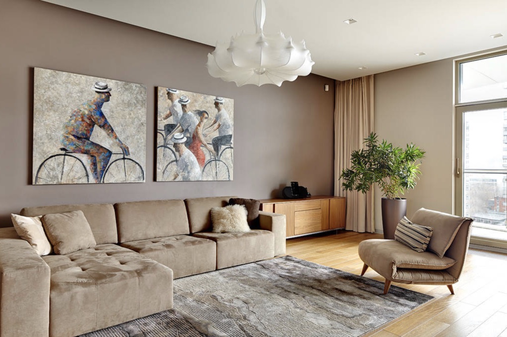 Важно: При развешивании картин учитывайте, что ее центр нужно располагать на уровне глаз смотрящего человека. Для стоящего человека это примерно 160 см, для сидящего на диване – 110 – 120 см. Если картина вытянута в высоту, то уровень отсчитывают не по центру, а от верхней трети.