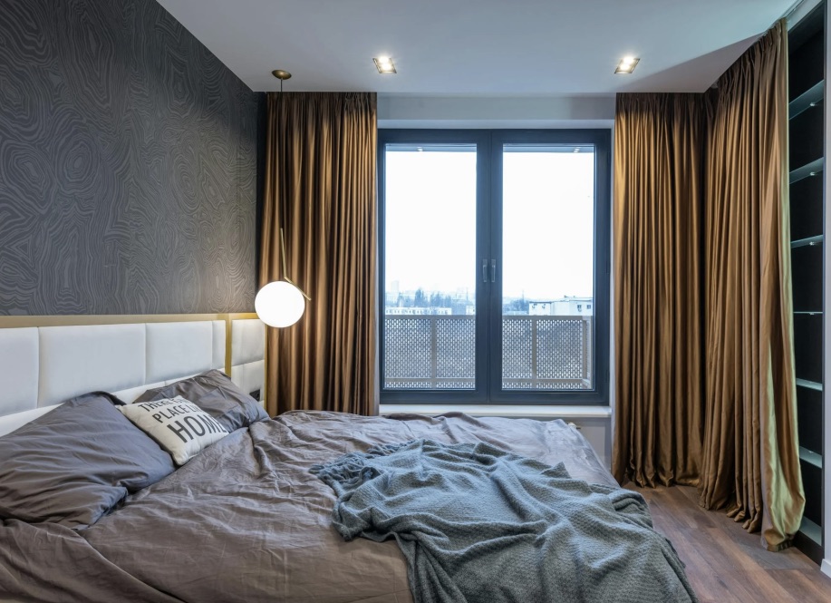 На фото интерьер спальни и ночные золотисто-бежевые шторы на окнах.