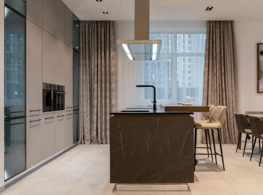 Занавески из светонепроницаемых тканей будут особенно уместны на кухнях с окнами, выходящими на южную сторону. Они будут актуальны как в ночное время для закрытия от посторонних глаз, так и позволят укрыть помещение от палящего солнца. А также придадут солидности всему интерьеру и создадут в нем тепло и уют.