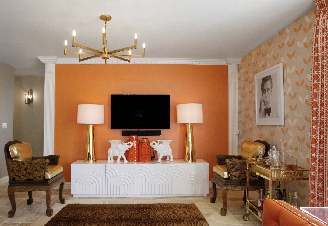 - Мебель. С оранжевыми обоями будет одинаково хорошо сочетаться светлая и темная мебель. Если при оформлении используется метод акцентной стены, то гарнитур, который стоит на ее фоне стоит выбрать светлого оттенка, так рисунок стене будет более заметен. На фоне оранжевых обоев будет удачно смотреться диван с коричневой или бежевой обивкой.