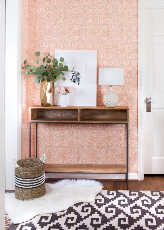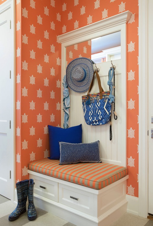 Для темной прихожей и коридора лучше выбрать светлый оранжевый оттенок обоев, персиковый или светло-оранжевый. Отделку можно комбинировать с другими материалами, например декоративным камнем или деревянными панелями.