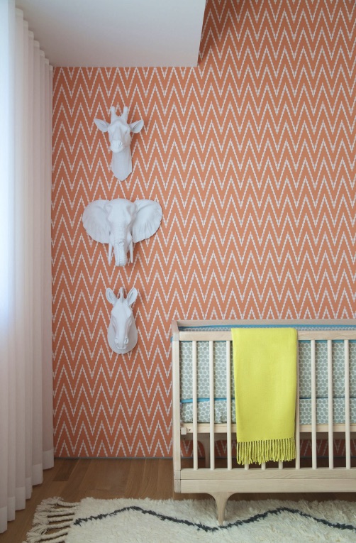- Геометрический узор. Геометрические узоры соответствуют современному оформлению помещений. Крупные узоры, например круги или треугольники, подойдут для оформления одной или двух стен комнаты, они будут акцентировать на себе внимание. Полоской или мелким узором можно отделать все стены комнаты. Кроме того направление узора способно зрительно сделать комнату выше или шире.