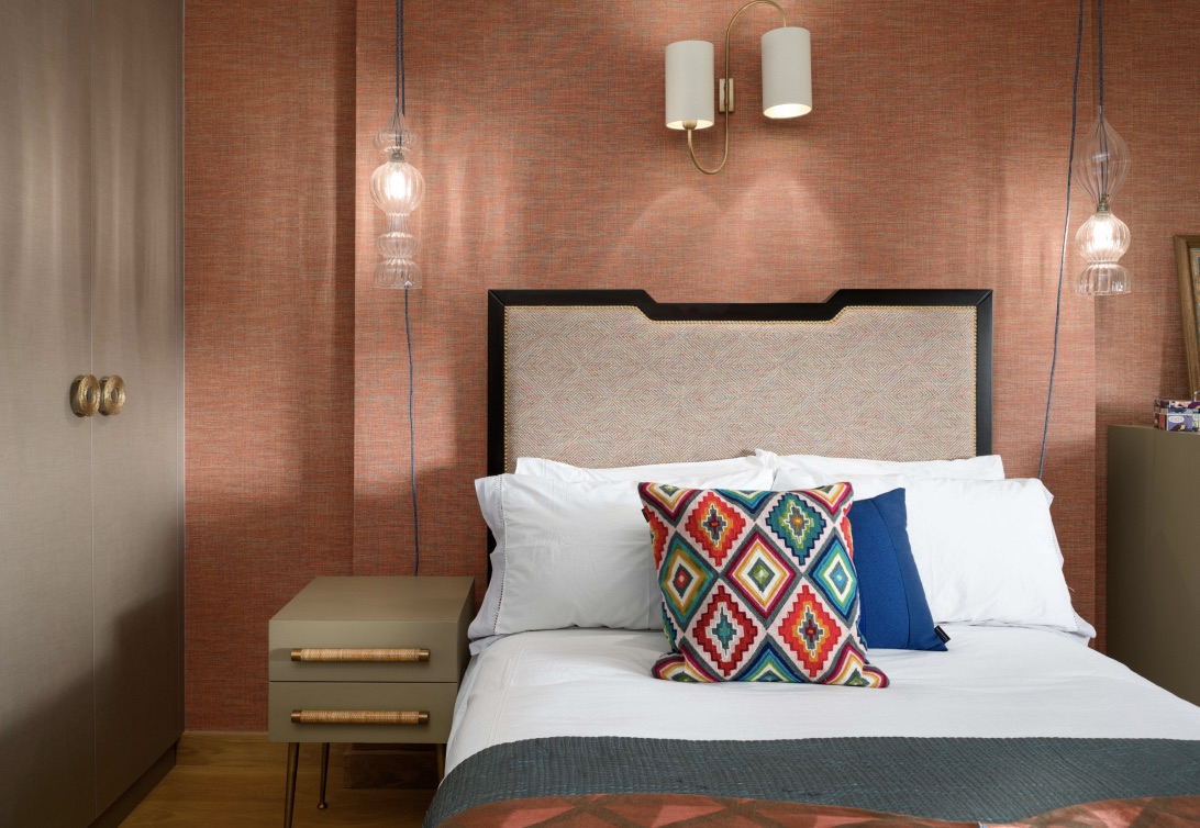 На фото спальня в современном стиле. Акцентом в интерьере стали стены с геометрическим узором.