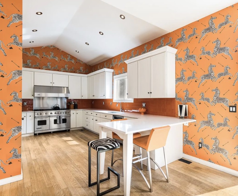 Оранжевый цвет на кухне создает позитивную атмосферу и настраивают на общение. Отделка может быть выполнена оранжевыми обоями полностью или частично, например, только над обеденной зоной или с яркими рисунками на светлом фоне.
