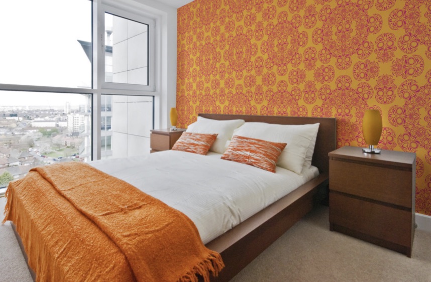 Для спальни лучше использовать обои спокойной цветовой гаммы, светло- или темно-оранжевый. В зависимости от стиля комнаты обои могут быть однотонные, с текстурой или рисунком. Так же можно использовать различную комбинацию цветов, отделку оранжевым цветом определенных зон или совмещение разных видов обоев.