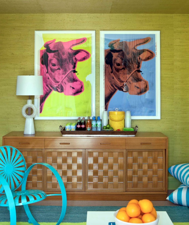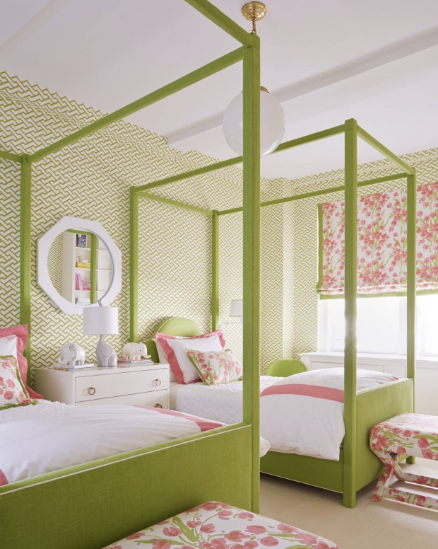 - С оранжевым. Образуют естественную и природную пару: как трава и закатное солнце, как радость и беззаботное детство. Чаще всего этот яркий дуэт используется в интерьере детской, так как эта комбинация цветов присутствует в детских игрушках и одежде.
