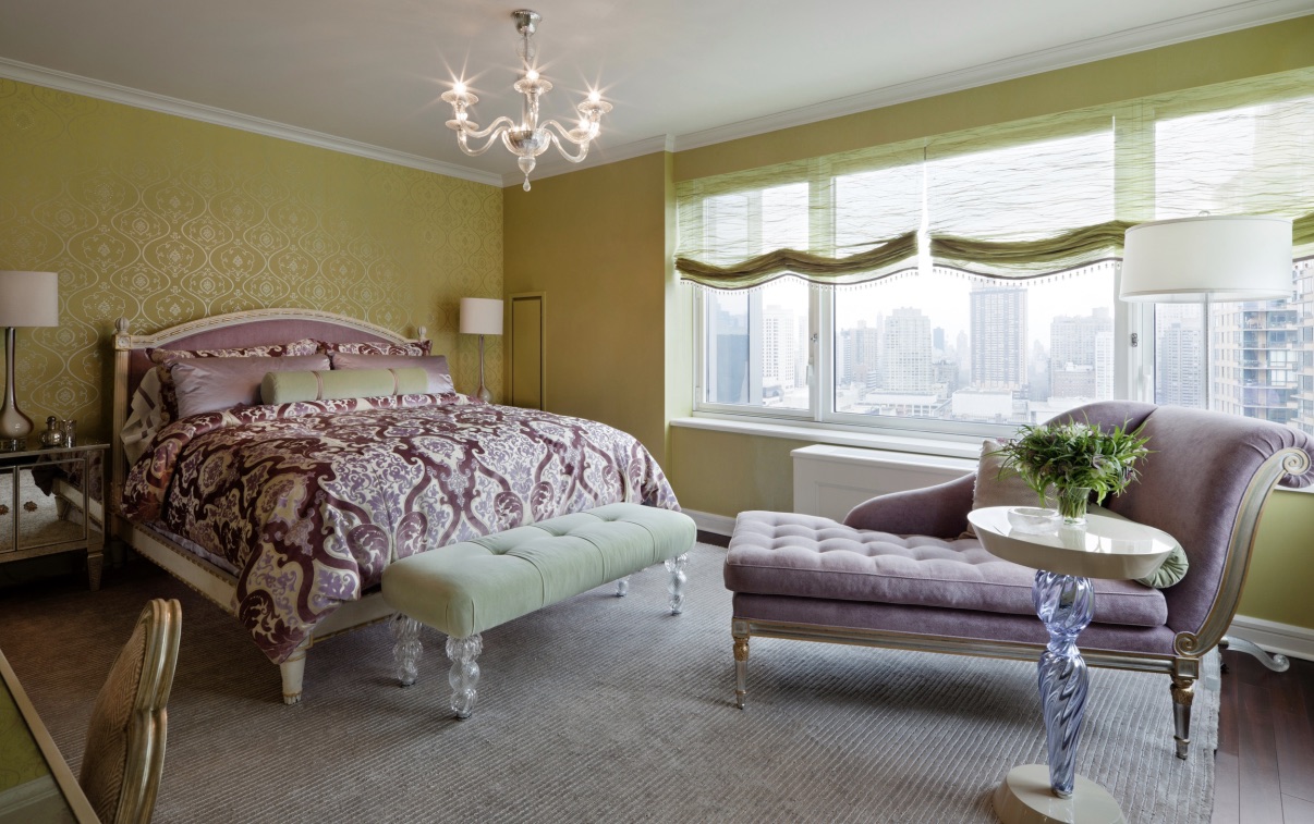 - Строгая и сдержанная классическая обстановка оживает и расцветает с появлением салатовых обоев в интерьере.