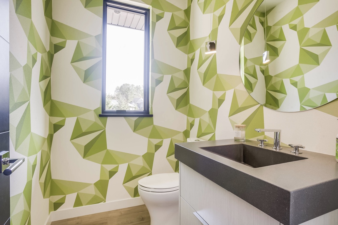- В современном интерьере особенно будут уместны обои салатового цвета, например хорошо будут смотреться светло-салатовые стены с крупным принтом или массивной геометрией.
