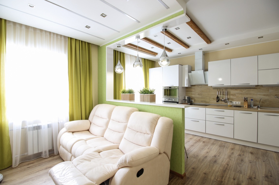 Гостиная по праву считается зоной отдыха. А все оттенки зеленого благоприятны для психологического комфорта. В гостиной в салатовых тонах интуитивно можно почувствовать себя на природе или в отпуске. Цвет создаст уютную атмосферу для душевных и настоящих разговоров. Вызовет чувство комфорта и позволит чувствовать себя спокойно.