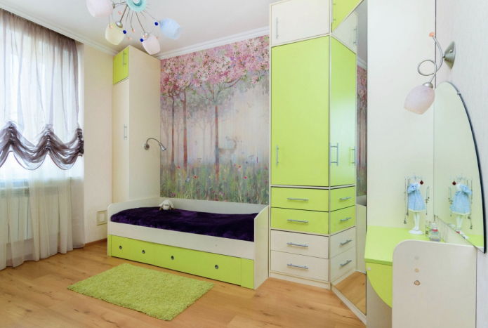 Зеленый цвет ассоциируют с весной – теплой и легкой. Часто этот цвет применяют в интерьерах детской комнаты, ведь зеленый благоприятно влияет не только на нервную систему, расслабляя человека, но и улучшает зрение и положительно сказывается на работе головного мозга.