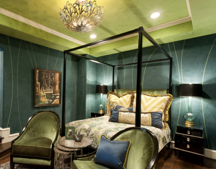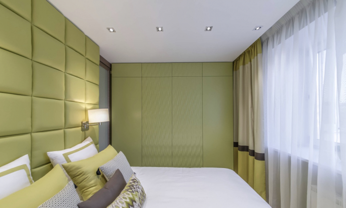 Зеленые оттенки расслабляют и умиротворяют, в спальне как никогда уместны и органичны. В спальне можно сочетать с салатовым цветом оттенок шампань: получится нежное и ласковое сочетание. Создастся ощущения прогревающего солнца, спальня будет казаться уютной, теплой и атмосферной.