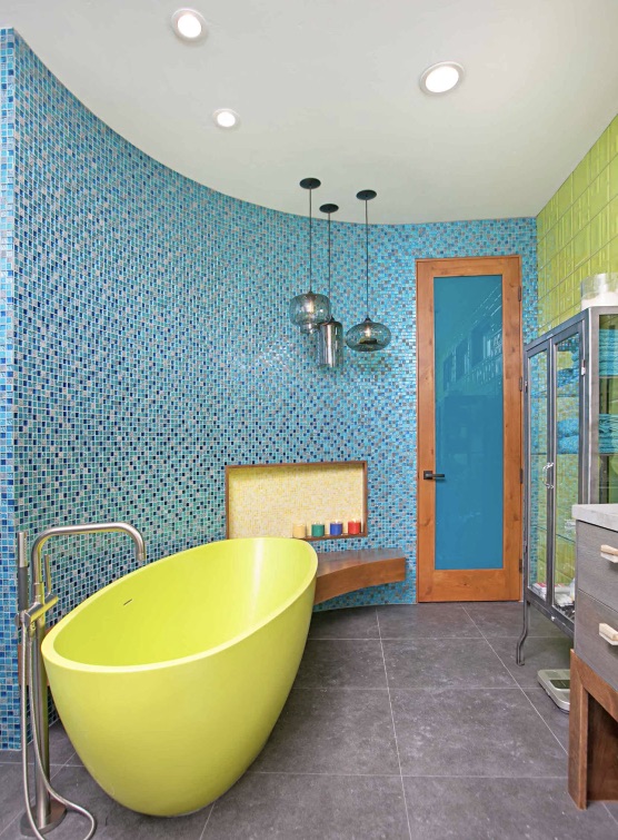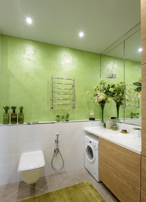 Где салатовые цвета могут заиграть по-новому, так это в ванной комнате. Здесь они могут сочетаться как со светлыми оттенками, так и с темными. Стильным решением будет так же сочетание с белым и чёрным. В ванной комнате сочно-салатовый придаст свежести и легкости.