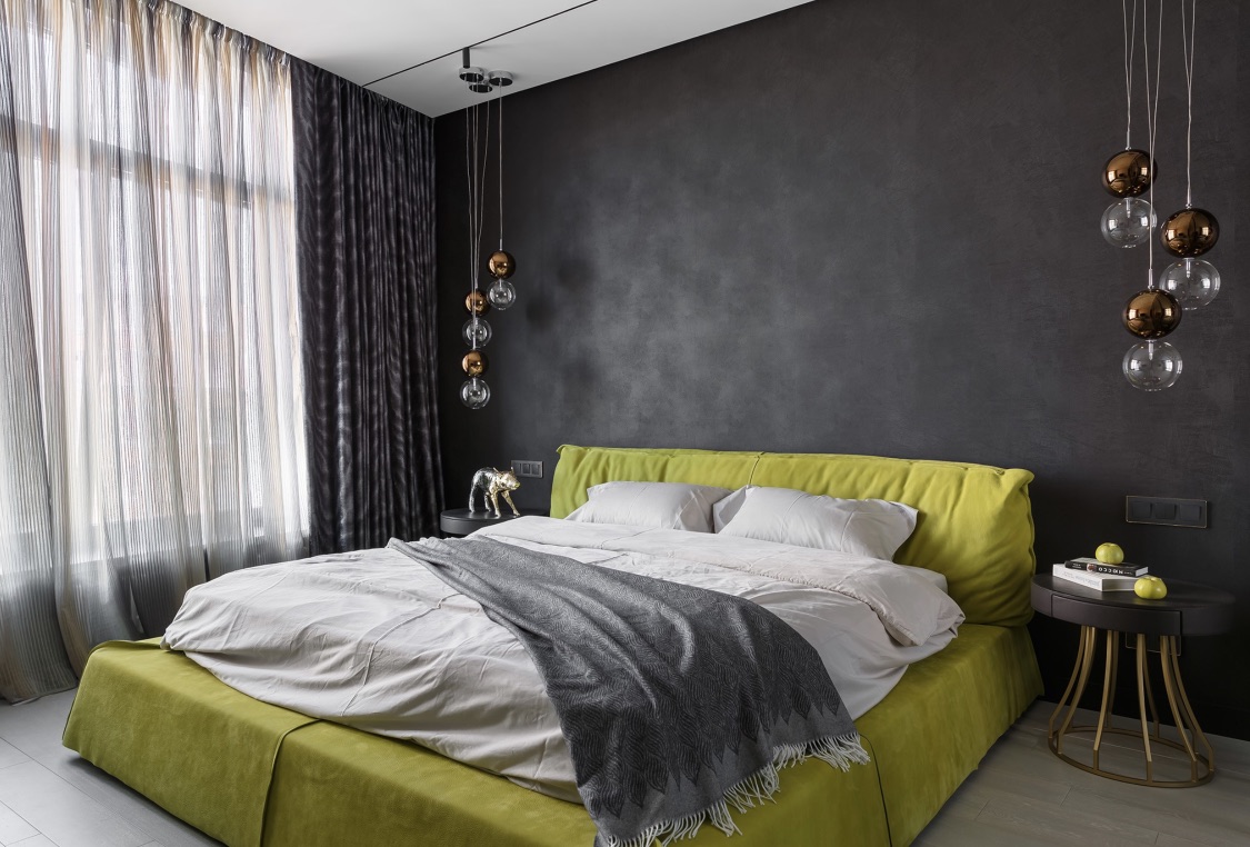 - Нейтральные стены (светлые или темные), на фоне которых размещается мебель в ярких, салатовых цветах.