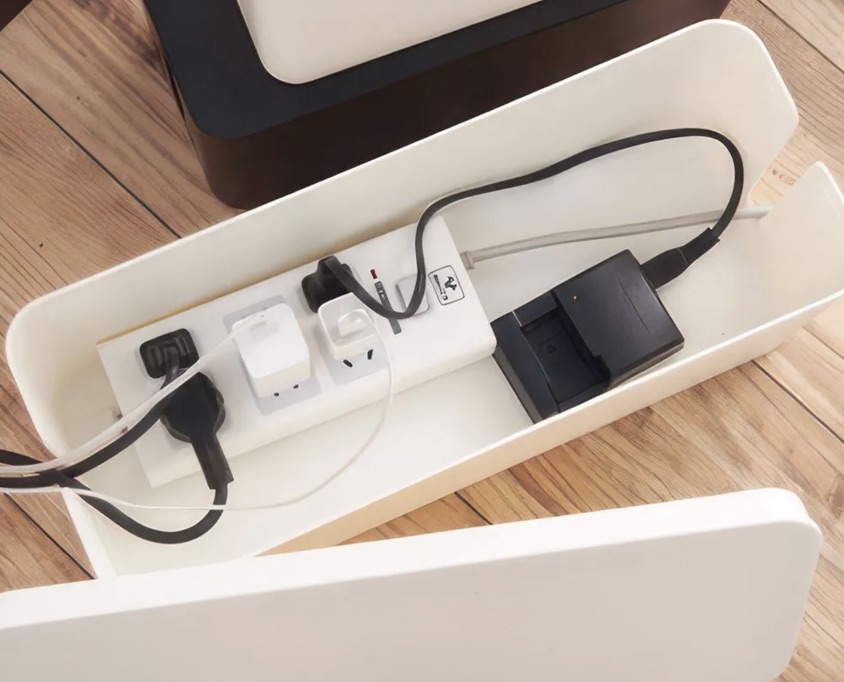- Спрятать провода вместе с розеткой поможет обычная коробка с отверстиями. Ценителям эстетики подойдёт специальная пластиковая ёмкость под цвет интерьера.