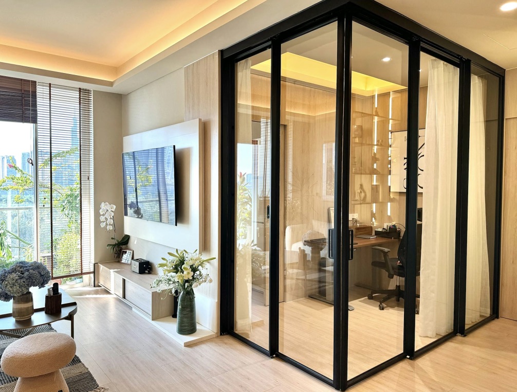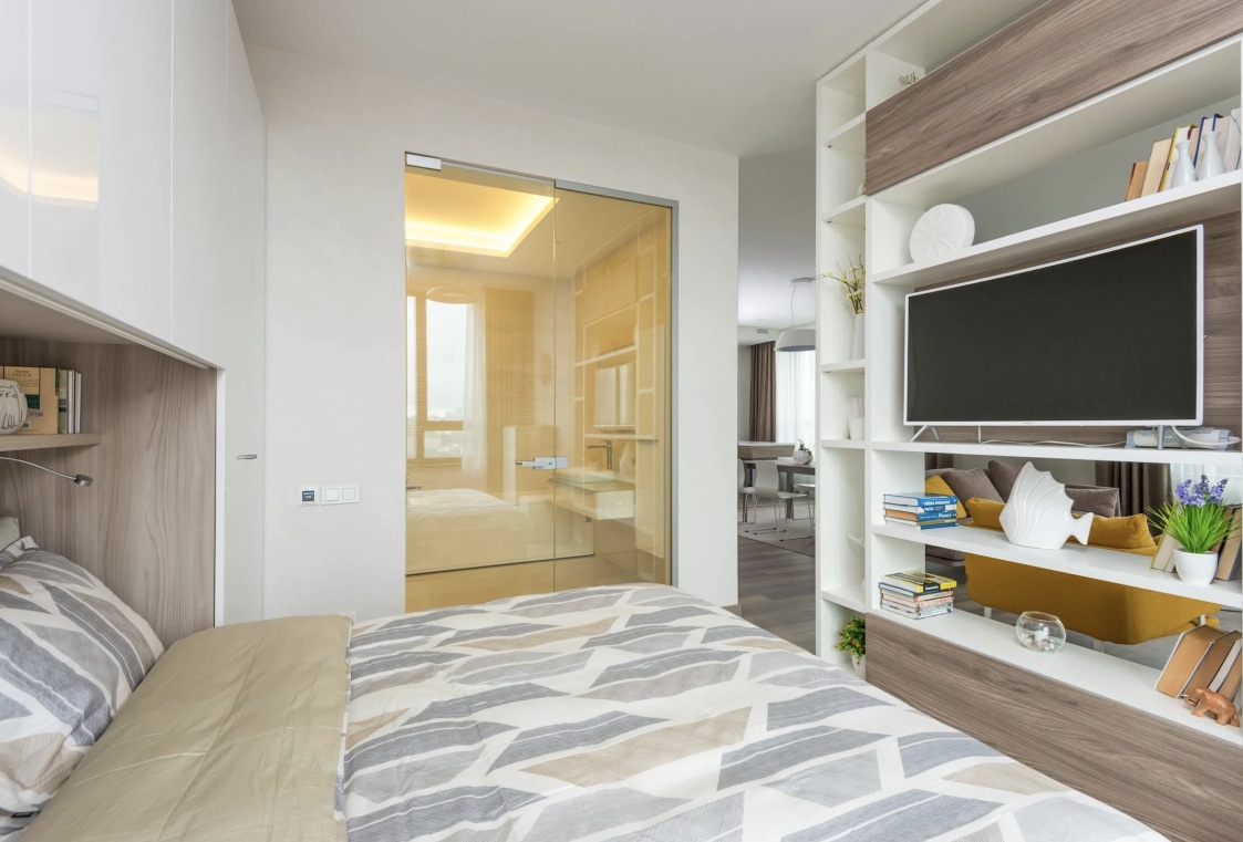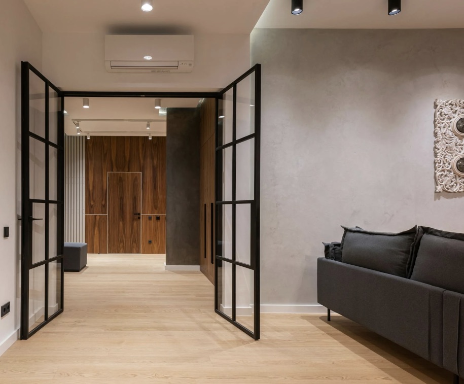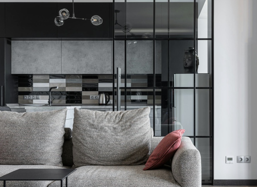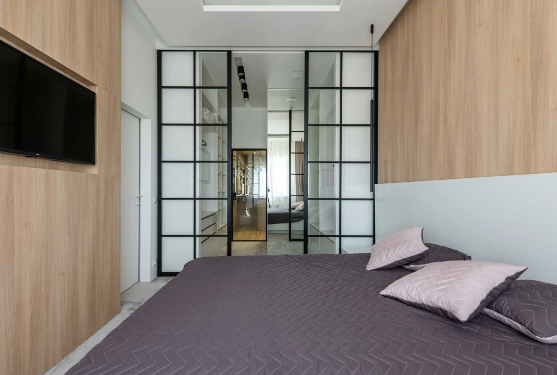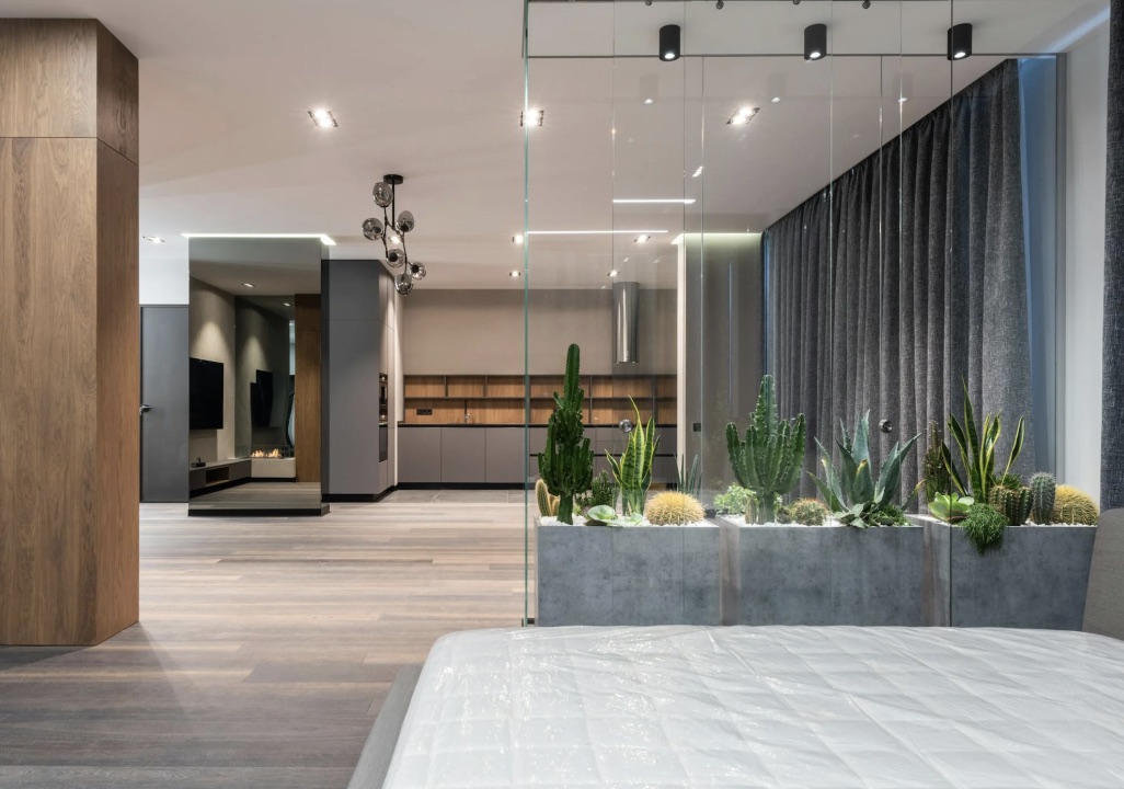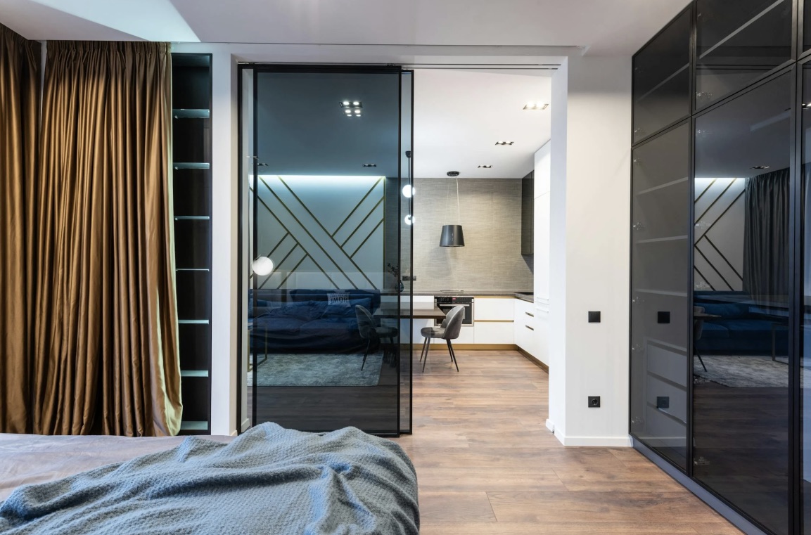 В других комнатах дома (гостиных, кухнях, спальнях) барьеры выполняют ту же функцию: зонирование с сохранением зрительной свободы помещения. Стены бывают статичные или раздвижные (выполнены по технологии дверей-купе).