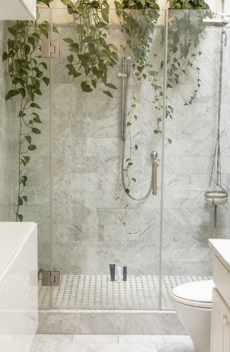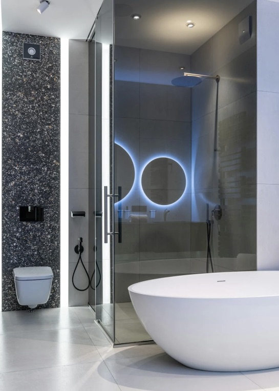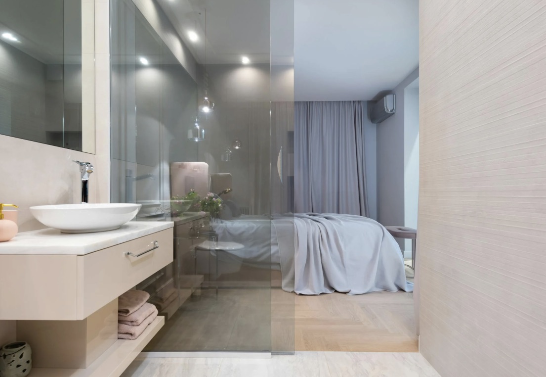 Стеклянные перегородки часто используются в душевых кабинах или на ванных вместо шторок. Позволяют оградить помещение от попадания воды, при этом сохранить визуальную легкость пространства.