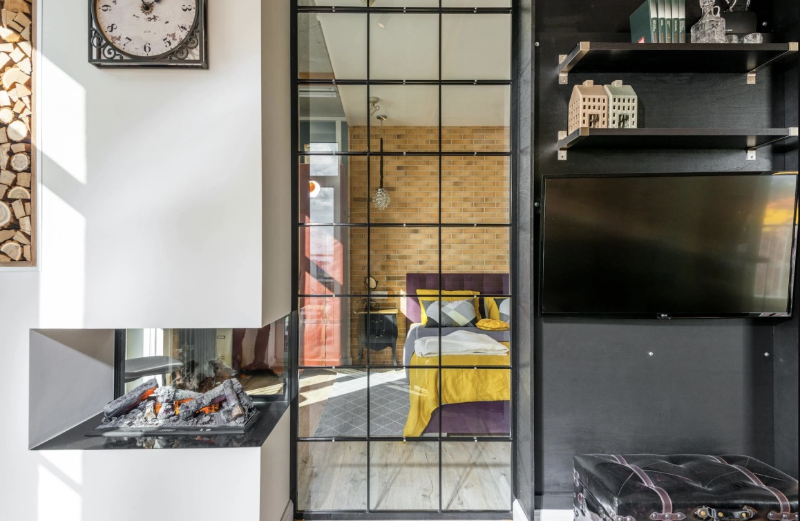 Стекло в интерьере на полу — редкость. Эффектный прием актуален для многоэтажных квартир и домов: позволяет наблюдать сверху за происходящим внизу.