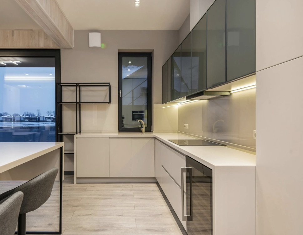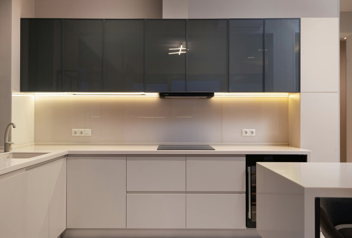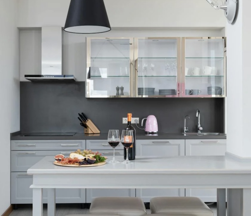 Стеклянные фартуки также называют скинали: благодаря цельному листовому материалу можно добиться бесшовного (в отличие от плитки) украшения рабочей зоны. При этом стекло на стене в интерьере не уступает плитке по практичности, наоборот: благодаря отсутствию швов даже превосходит ее.