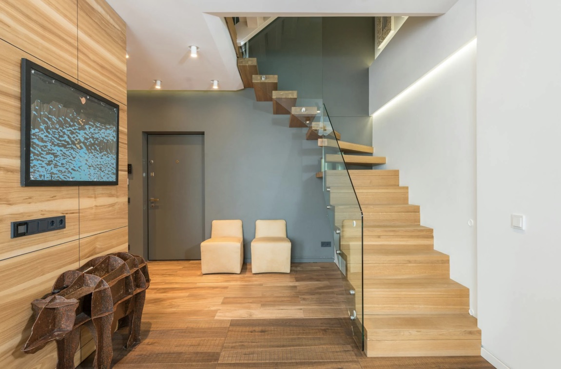 Стекло в интерьере лучше всего заметно в больших элементах, таких как стенки или лестницы.