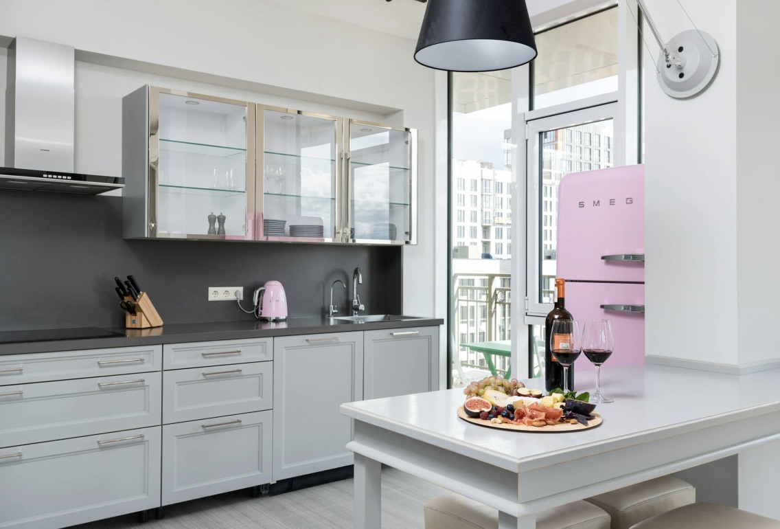 Верхние шкафчики со стеклянными дверцами — компромисс между навесными шкафами и открытыми полками. С одной стороны, в них, как в витрине, видно все содержимое. С другой, двери защищают посуду от оседания пыли, жира.