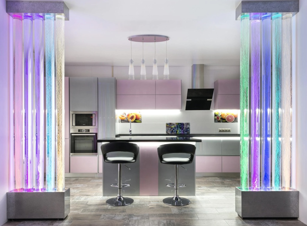 Например, в спальне можно позволить себе панели с рисунком. Для кухни и ванной лучше брать легкомоющееся: существуют специальные виды с гидрофобным и олеофобным покрытием.